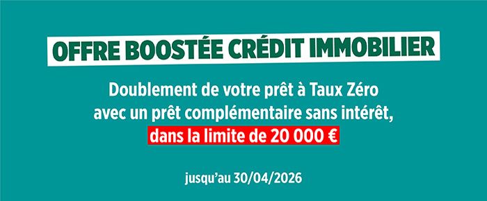 Prêt immobilier complémentaire dans la limite de 20 000 € par dossier. Offre valable du 02/11/2023 au 30/04/2026 dans les Caisses régionales participantes. Les prêts sont accordés sous réserve d’étude et d’acceptation de votre dossier par votre Caisse régionale, prêteur. Vous disposez d’un délai de réflexion de 10 jours pour accepter l’offre de prêt. La réalisation de la vente est subordonnée à l’obtention du prêt. Si celui-ci n’est pas obtenu, le vendeur doit vous rembourser les sommes versées. Les contrats d’assurance emprunteur sont assurés par : PREDICA, compagnie d'assurances de personnes, filiale de Crédit Agricole Assurances, entreprise régie par le Code des assurances, S.A. au capital de 1 029 934 935 € entièrement libéré - siège social : 16-18 boulevard de Vaugirard, 75015 Paris - 334 028 123 RCS Paris.