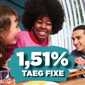 Exemple : pour un prêt étudiant et apprenti amortissable de 18 000€ d’une durée de 60 mois, au taux annuel débiteur fixe de 1,50%, 59 mensualités de 311,58€ et une dernière mensualité ajustée de 311,50€. Taux Annuel Effectif Global (TAEG) fixe de 1,51%. Montant total dû de 18 694,72€ dont intérêts de 694,72€ hors assurance facultative. Pas de frais de dossier. Le coût de l’assurance emprunteur facultative(4) est de 19,04€ par mois pour un assuré de moins de 18 à 59 ans couvert à 100% et s’ajoute à l’échéance de remboursement du crédit(si vous l’avez souscrite). Le montant total dû par l’emprunteur au titre de l’assurance, sur la durée totale du prêt, est de 1 142,40€, pour un Taux Annuel Effectif de l’Assurance(TAEA) de 2,45%. Le coût de l’assurance peut varier en fonction de votre situation personnelle. Les conditions et événements garantis sont indiqués au contrat.