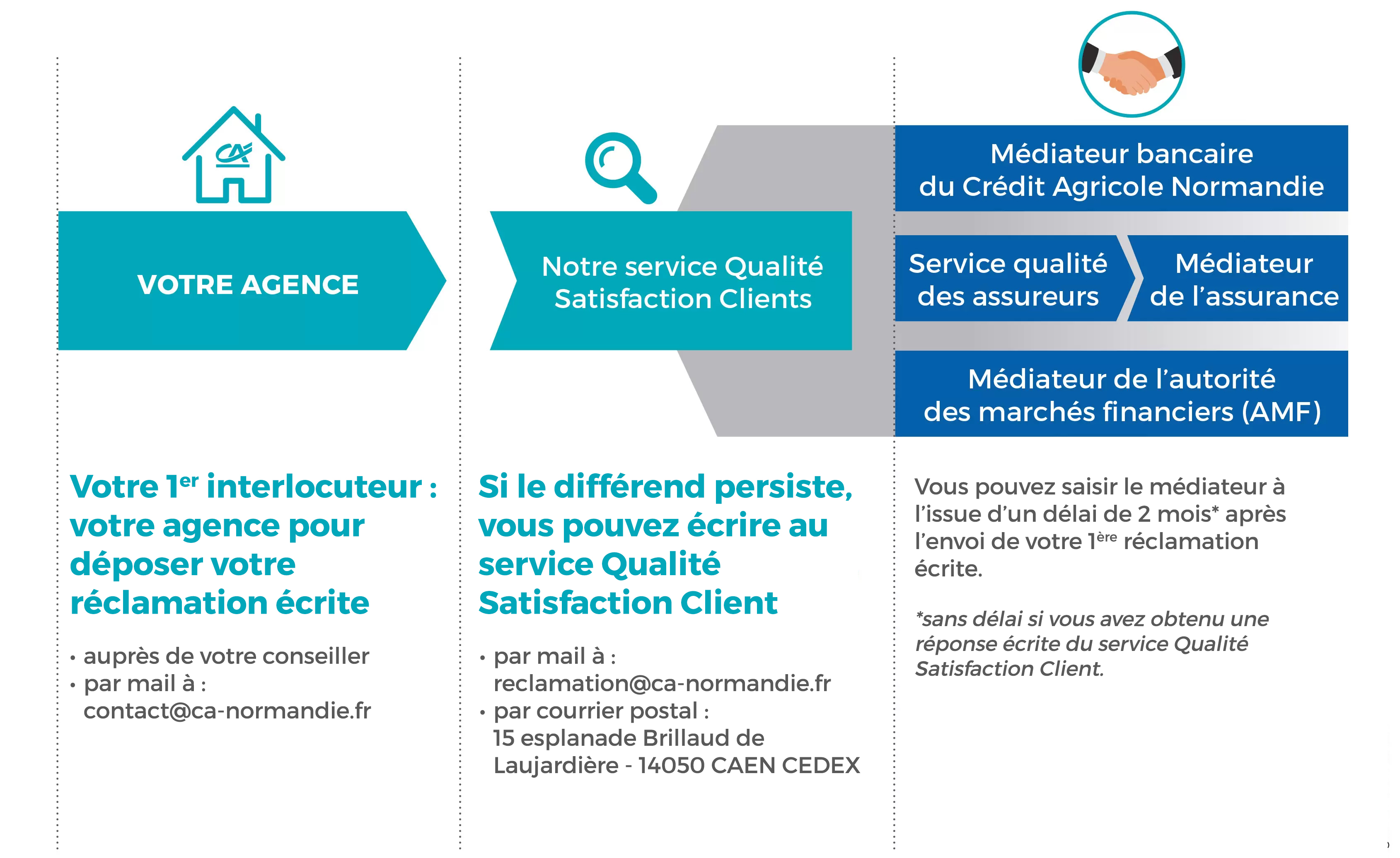 - Le Service Qualité Satisfaction Client : Si la réponse apportée préalablement par votre conseiller ou le directeur de votre agence ne vous satisfait pas vous pouvez contacter le Service Qualité Satisfaction Client en charge des réclamations par courriel à reclamation@ca-normandie.fr ou par voie postale à l’adresse suivante : Service Qualité Satisfaction Client - 15 Esplanade Brillaud-de-Laujardière - CS 25014 - 14050 Caen Cedex 4 de la Caisse régionale Normandie
