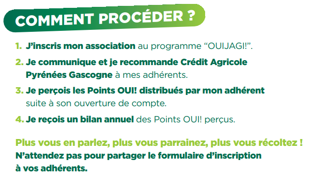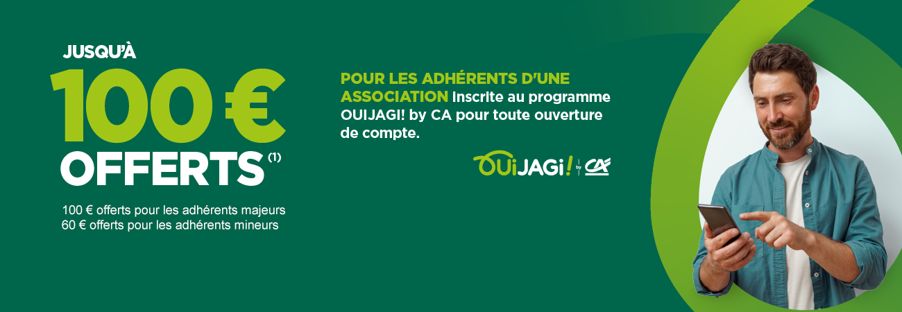 (1) Offre valable jusqu'au 31/12/2025, réservée aux personnes physiques, adhérentes d'une association cliente de Crédit Agricole Pyrénées Gascogne inscrite à OUIJAGI! by CA, pour toute entrée en relation avec le Crédit Agricole Pyrénées Gascogne. L'entrée en relation est soumise à l'accord de Crédit Agricole Pyrénées Gascogne.